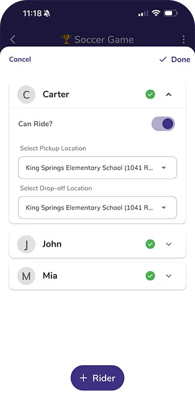 Coordinate rides for your entire family with Kid Hop's enhanced rider management feature, designed to handle multiple children and varied schedules: