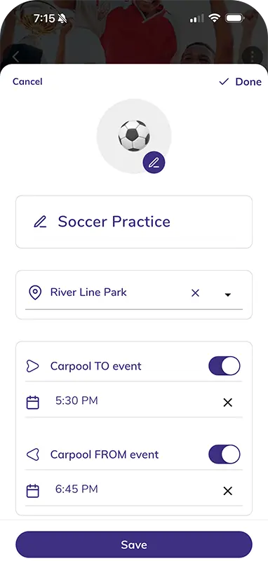 Perfect for families juggling multiple activities, the multi-event feature lets you use one carpool group for all your coordination needs. Whether it's Monday soccer practice, Wednesday music lessons, and Friday school pickups, you can manage everything in one place while keeping each event's details organized and distinct. Your carpool members can see which events they're part of and manage their availability for each one independently.