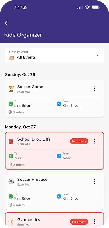 The Organizer Dashboard is your mission control for carpool management. Whether you're coordinating a small neighborhood carpool or managing multiple groups for different activities, this centralized view ensures nothing falls through the cracks. See potential problems before they become issues, like uncovered events or scheduling conflicts, and resolve them with just a few taps. Perfect for carpool administrators who want to ensure smooth operations.